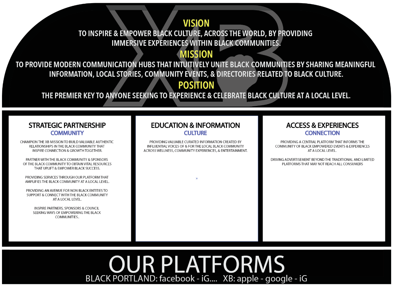 XB is an app dedicated to inspire & empower black communities by providing access to immersive experiences of black culture at a local level. Especially designed to amplify black culture in cities where it can be difficult to find. XB offers a modern communication hub that provides three pillars of services: Culture – Connection - Community